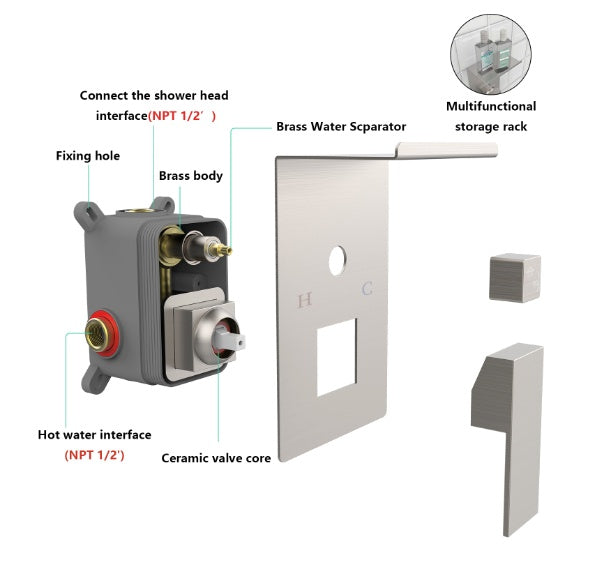 E*cellent design and durability: the modern style design with a brushed nickel finish, the water valve controller comes with a storage rack that can hold items such as facial cleanser soap toothpaste etc. It is made of brass and stainless steel material structure, which can easily avoid surface corrosion caused by humid environments in the bathroom.