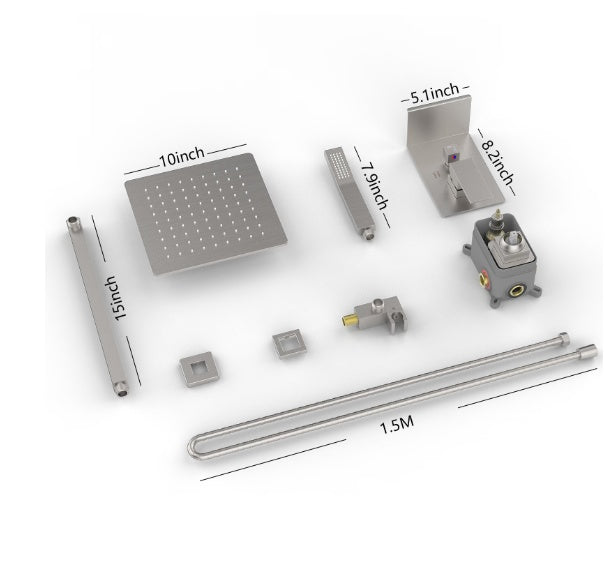 Included Components 1.5 meter shower water inlet hose, Cold and hot control handle, Control valve box, handheld shower nozzle, shower bracket, 10 inch square shower nozzle, 15 inch shower arm